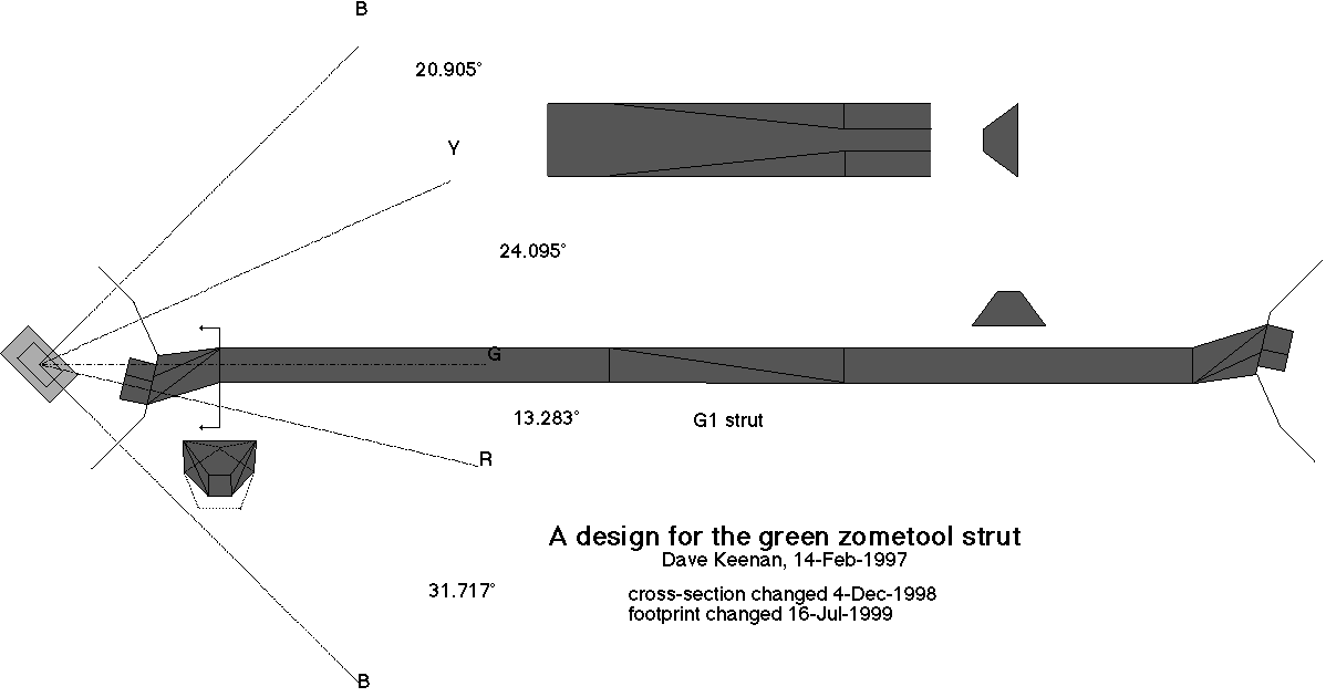 I helped them design the green struts that became available in mid 2000. Here's the last of my green strut designs that I made a drawing of, but my final preference for the cross-section was for a kite shape, not the keystone. I made a spreadsheet that rotates a 3D image of the strut. This became the precursor to the musical rotating 4D dekany you will find in the unusual musical scales section below. In the end they chose Baudoin and Vienne's rhombic cross-section. By the time I proposed the reduced "toe" to relieve the visual impact of the kink, prototype tooling had apparently already gone too far. But at least George Hart and I managed to convince them to make the length set that is now called "whole greens". Baudoin and Vienne insisted that the correct length set was the one now rightly called "half greens", which George Hart and I can see no need for.