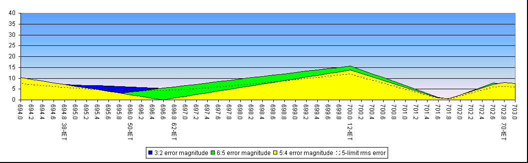 We can recognise 5 regions of interest at: 694, 702, 704/706, 709 and 715 cents (±1 cent). The 704/706 refers to the fact that the minimum for this region moves considerably between the 5-limit and 7-limit cases. Note that four of these are essentially the same as those we found for the single chain tunings (within a cent), but we have lost the meantone region near 697 and gained a new region at 704/706.