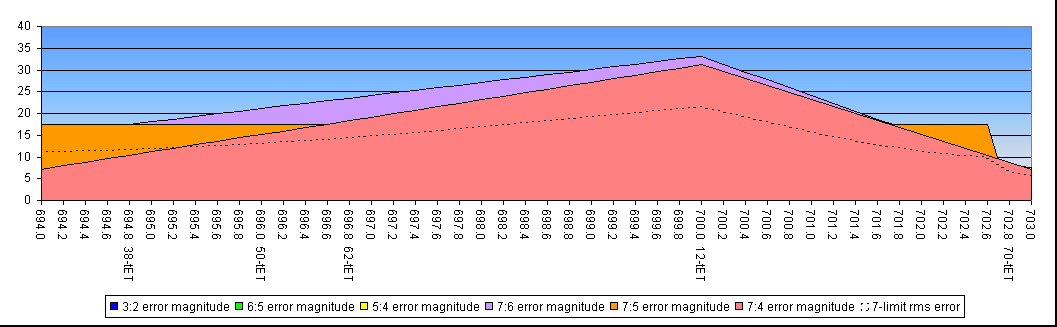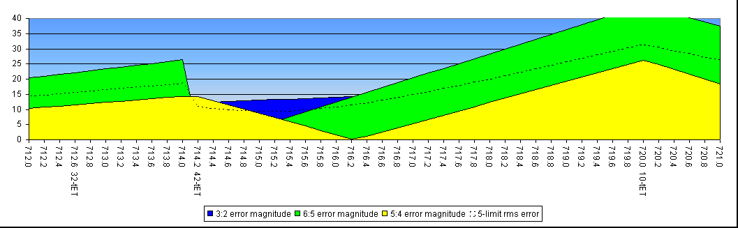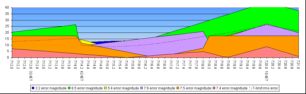Note that most of these regions can do no better than to represent the 5:7 as the half-octave (the orange plateaus at a height of 17.5 cents). The 704 and 715 cent regions do better than this, but with other costs.