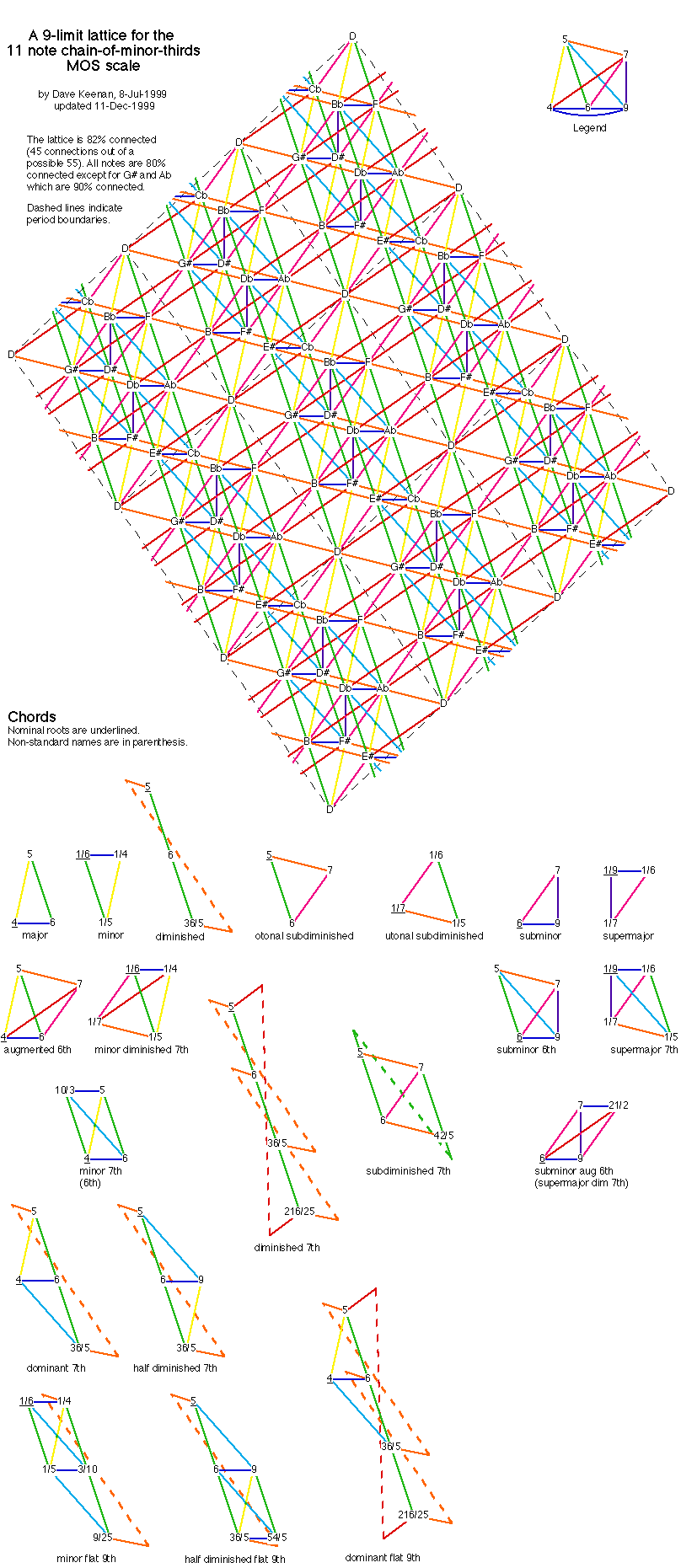 So we expect that plus and minus 4, 8 and 10 links will produce dissonances. 4 and 8 links are indeed dissonant since they correspond to 1 and 2 small steps (chromatic semitones). -10 links, of which there is only one example in an 11 note chain, is similar in concept to the meantone wolf but just happens to give a more accurate 7:9 than does 9 links (equally accurate in 19-tET). This "wolf" 7:9 (more like a poodle) is not shown in the lattice above.