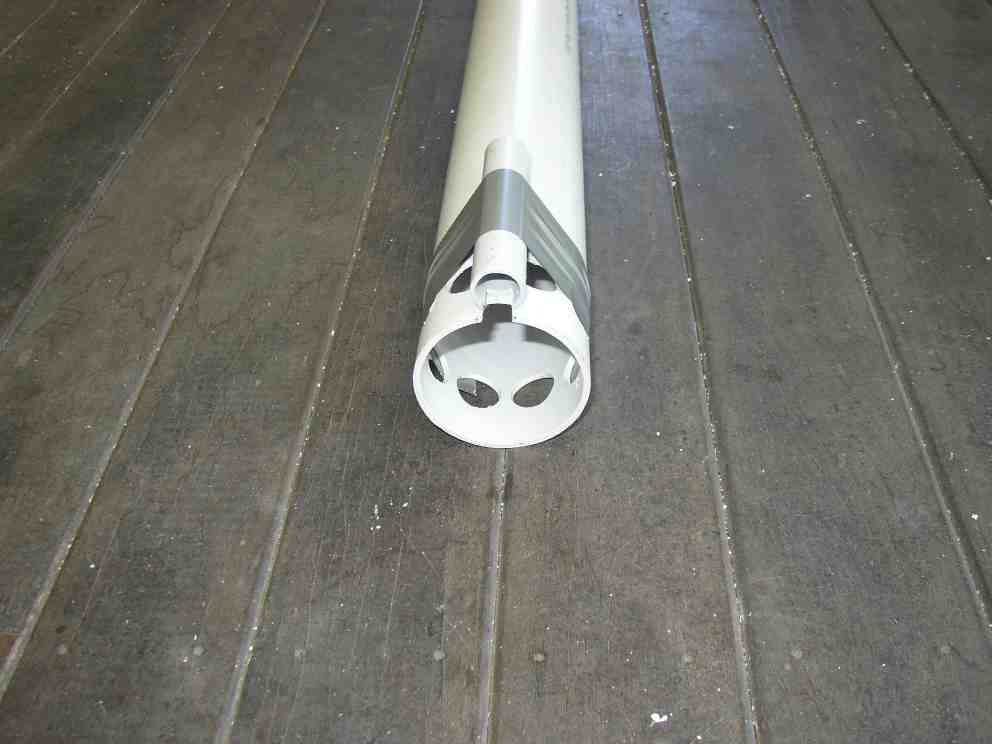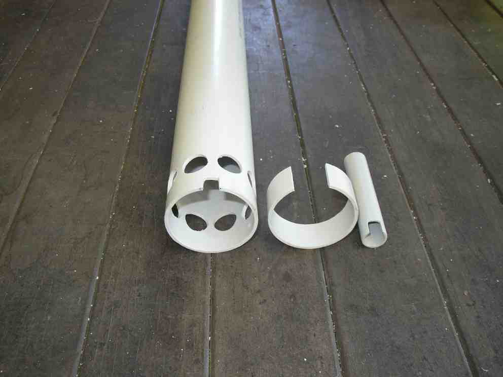 First we cut the intake holes in the lift tube and make it able to house the motor and propeller. Cut a length of 65 mm DWV PVC pipe 70 mm shorter than the original maximum depth of the pool, typically 1.2 m. If in doubt, cut it oversized. You can fine tune it later when the undergravel filter is in place and the pond is full of water. Use a sheet of A4 paper wrapped around the pipe to draw a straight line for the cut.