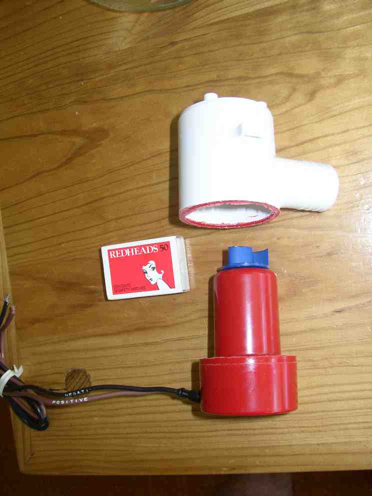 Cut the wires 40 mm from the pump body. Unclip and dispose of the blue strainer. Using a hacksaw carefully cut the outer white part of the bilge pump (the pump chamber) away from the red part (the waterproof motor housing). Cut just on the red side of the welded seam and work your way around and around, never letting the blade penetrate more than 8 mm, until the white part comes away and can be disposed of. Use a file to remove the burring on the red part, caused by the hacksaw, and to chamfer the outer edge of the cut so it will be easier to insert into the pipe later.