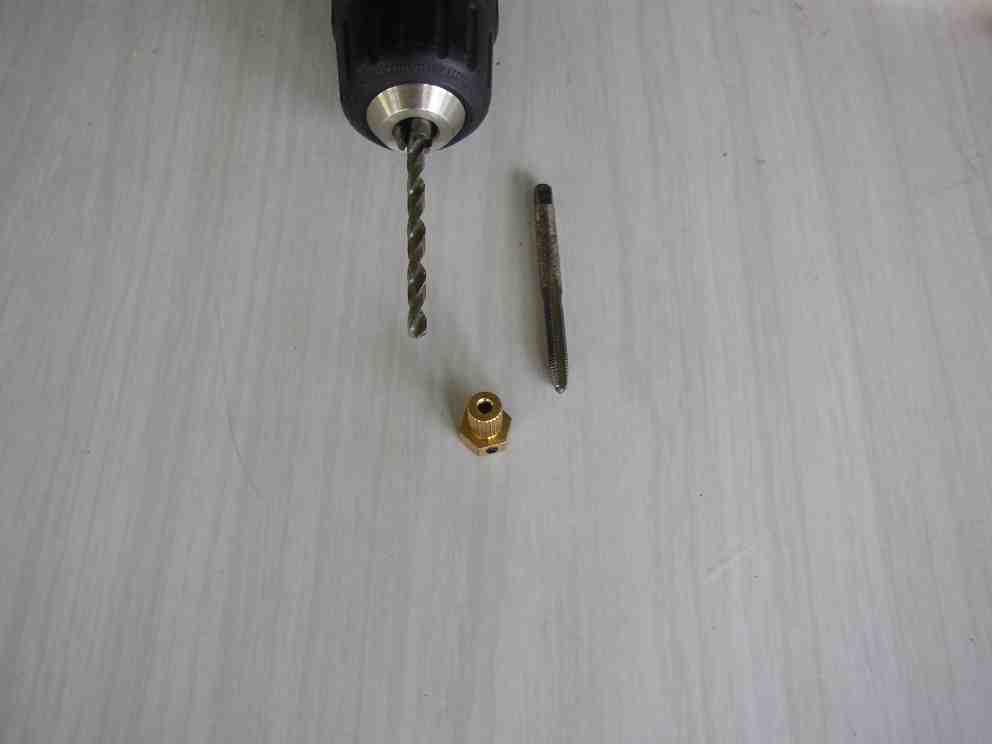 Now we drill and tap the brass coupling (which currently has an unthreaded 1/8" hole through it) to cut an M5 thread in one end of the hole.