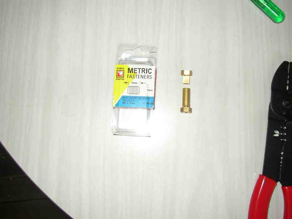 Now we join the propeller to the newly threaded brass coupling using an M5 set screw (not the much smaller set screw that is already in the side of the brass coupling). The aim is to have the M5 set screw completely isolated from the water by means of the superglue, without gluing your fingers, and with half its thread in the brass coupling and half in the brass insert of the propeller.