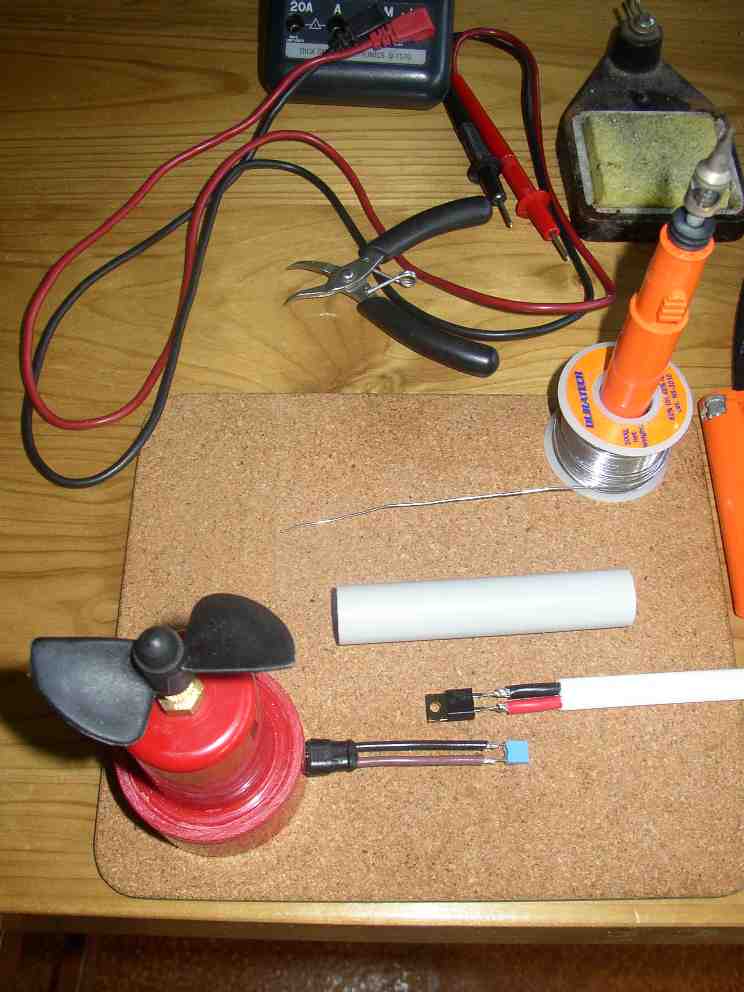 Next we join the heavy duty marine cable and radio interference suppression capacitor to the motor cable in such a way that they will fit inside the 20 mm conduit that we glued to the lift tube.