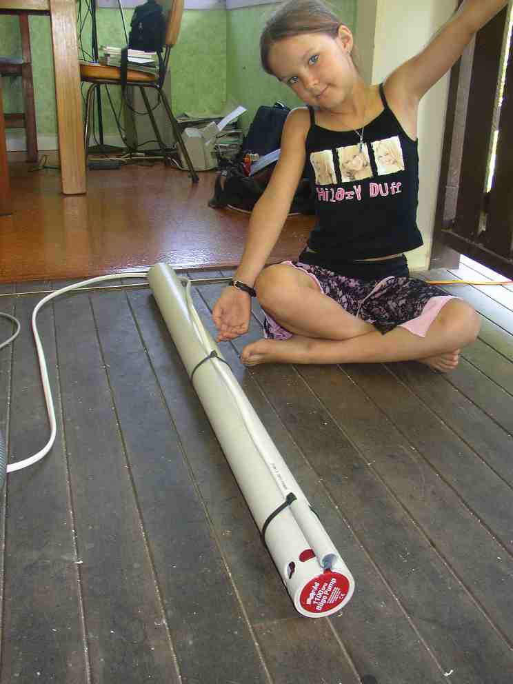 Fill the conduit with neutral-cure silicone by putting the nozzle in to the middle and withdrawing it slowly as the conduit fills. Do this from both ends of the conduit. Use a 300 mm plastic cable tie to tie the marine cable to the lift-tube near the conduit. Remove the tape near the middle of the lift tube and use another 300 mm cable tie in its place. Set it in a safe place while the silicone cures, preferably overnight. See the photo of the completed unit at the start of this article.