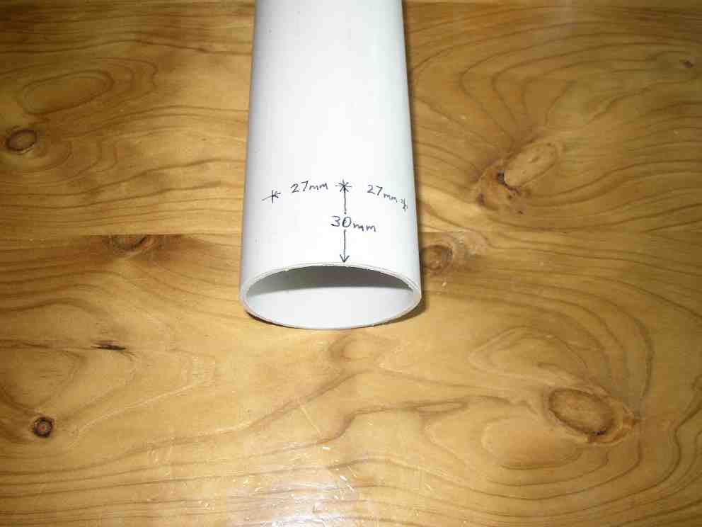 We need to cut eight intake holes around the circumference of the pipe, near one end. Mark at intervals of 27 mm along one edge of the sheet of A4 paper (27, 54, 81, 108, 135, 162, 189, 216 mm). Wrap the paper around the pipe and use it to draw a line 30 mm from one end of the pipe, then mark along this line at the 27 mm intervals. These are the centres of the intake holes.